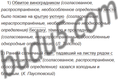 1) Обвитое виноградником место было похоже на крытую уютную беседку, тёмную и прохладную. (Л. Толстой) 2) Ранний солнечный свет, падавший на листву, рядом с цветами шиповника казался холодным и бледным. (К. Паустовский)