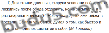 1) Дни стояли длинные ст..рухи усп..вали всё и устав л..жились после обеда отдохнуть но не засыпали а разговаривали лёжа. (В. Распутин) 2) Ночами лёжа в постел.. Самги́н улыбался думая о том, как быстро и просто он пр..влёк с..мпатии к себе. (М. Горький)