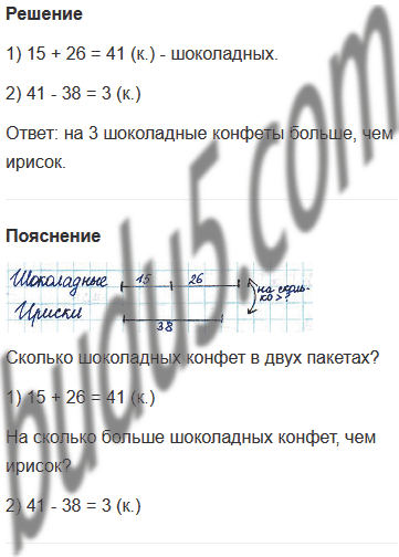 Задание № 4. В одном пакете 15 шоколадных конфет и 38 ирисок, а в другом - 26 шоколадных конфет. Каких конфет больше в этих двух пакетах: шоколадных или ирисок? На сколько больше?
