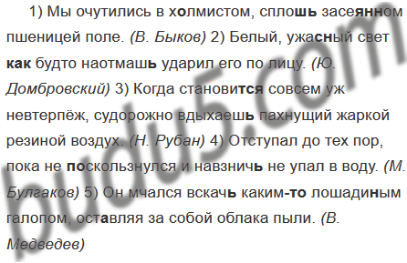 1) Мы очутились в х..лмистом, спло(?) засе..(н,нн)ом пшеницей поле. (В. Быков) 2) Белый, ужас(?)ный свет (как)будто наотмаш(?) ударил его по лицу. (Ю. Домбровский) 3) Когда становит(?)ся совсем уж(?) невтерпёж(?) судорожно вдыхаеш(?) пахнущий жаркой резиной воздух. (Н. Рубан) 4) Отступал до тех пор, пока не по(?)скользнулся и навзнич(?) не упал в воду. (М. Булгаков) 5) Он мчался вскач(?) каким(то) лошади(н, нн)ым галопом, ост..вляя за собой облака пыли. (В. Медведев)