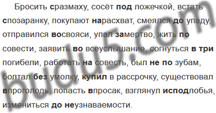 (С)размаху, (под)ложечкой, (с)позаранку, (на)расхват, (до)упаду, (во)свояси, (за)мертво, (по)совести, (во)всеуслышание, (в) (три) погибели, (на)совесть, (не)(по)зубам, (без)умолку, (в)рассрочку, (в)проголодь, (в)просак, (ис)(под)лобья, (до)(не)узнаваемости.
