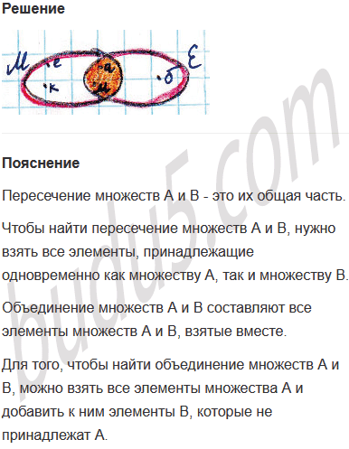 Задание № 5. Известно, что М = {а; е; м; к}, D = {а; б; м}. Найди их пересечение М Е и объединение М Е. Нарисуй диаграмму множеств М и Е и отметь их элементы. Закрась множество М Е и обведи М Е.