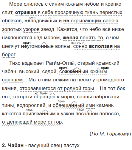 Море слилось с синим южным небом и крепко спит (отражать) в себе прозрачную ткань перистых облаков, (не) подвижных и (не) скрывающих собою золотых узоров звёзд. Кажется, что небо всё ниже наклоняется над морем (желать) понять то, о чём шепчут (не) угомо(н, нн)ые волны сонно (всползать) на берег.