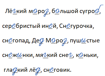 Лё_кий м_ро_, б_льшой сугро_, сер_бристый ин_й, Сн_гурочка, сн_гопад, Де_ М_ро_, пуш_стые сн_ж_нки, мя_кий сне_, к_ньки, гла_кий лё_, сн_говик.