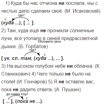 1) Куда бы нас отчизна (н..)послала мы с честью дело сделаем своё. (М. Исаковский) 2) Там куда ещё (н..)проникли солнечные лучи всё утопало в синей предрассветной дымке. (Б. Горбатов) 3) На высоком голубом небе (н..)облачка. (К. Станюкович) 4) Чего только (н..)было на столе! (И. Гончаров) 5) Я (н..)оставлю вас пока (н..)дадите ответа. (А. Пушкин) 6) Кто (н..)бывал в тайге Уссурийского края тот (н..)может себе представить какая это чаща, какие заросли. (В. Арсеньев) 7) Как (н..)мал дождь в лесу он всегда вымочит до последней нитки. (В. Арсеньев) 8) Мороз (н..)смягчается (н..)(на)минуту. (И. Гончаров)